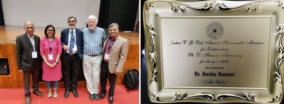 Picture of me after receiving the Young Scientist award in Radio Astronomy during URSI-RCRS in 2022 (left). On the right side is the Justice Oak outstanding thesis award (honorable mention) from the Astronomical Society of India in 2022. Unfortunately, I could not go in person to receive this award.