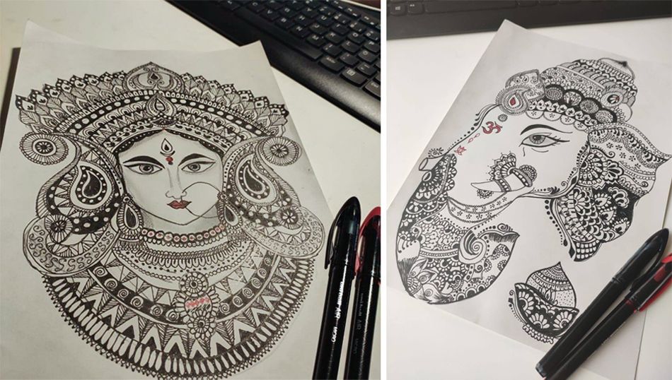 Here are my drawings of two Indian deities: Goddess Durga, symbolizing strength (left), and God Ganesha (right), symbolizing wisdom. I created these drawings during an Indian festival while I was residing in Helsinki.