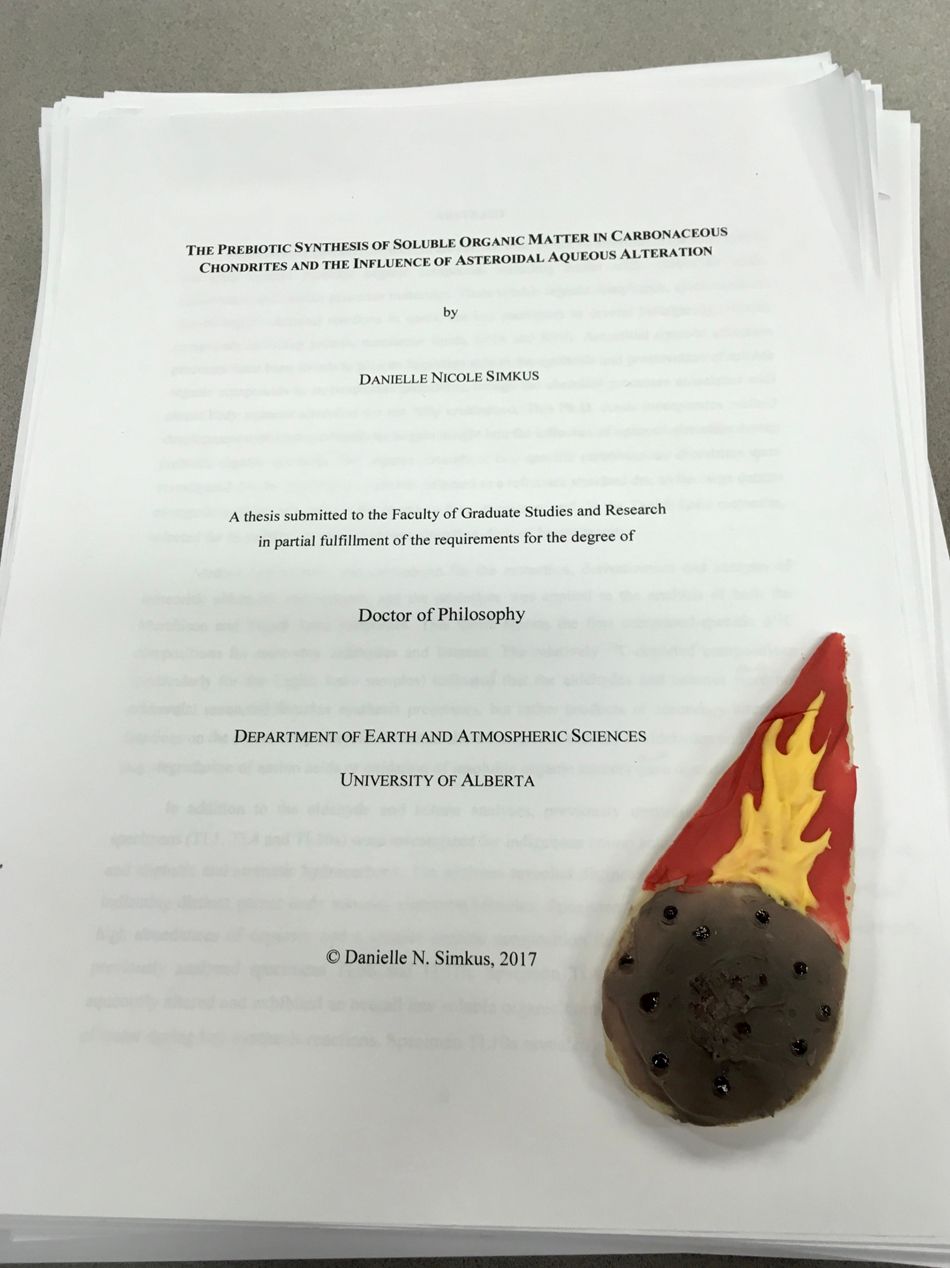 My Ph.D. dissertation titled “The Prebiotic Synthesis of Soluble Organic Matter in Carbonaceous Chondrites and the Influence of Asteroidal Aqueous Alteration”, accompanied by one of the meteor cookies I baked the night before my defense, definitely not intended to bribe my thesis defense committee.