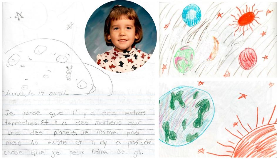 A journal article and some of my drawings from French immersion elementary school in Canada. Here, I wrote: “I think there are aliens. And there are Martians on one of the planets. I don’t like it, but they exist, and there’s nothing I can do about it.”