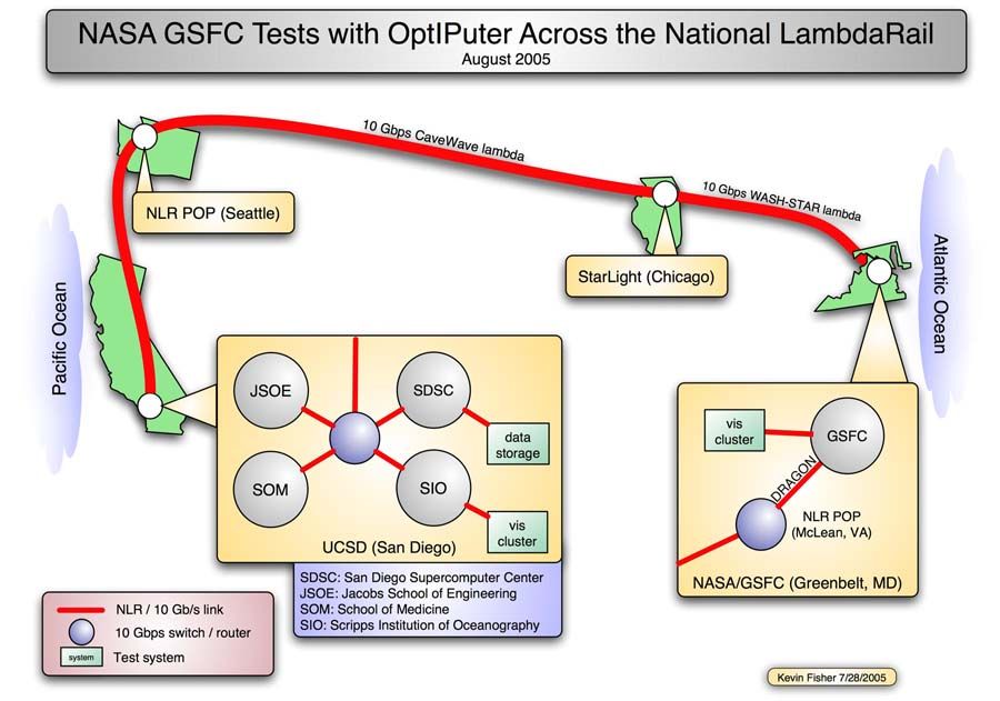 - On August 8, 2005, a demo of "21st Century National-Scale Team Science", involving UCSD and GSFC linked using OptIPuter technologies over a 10-Gbps lambda across the NLR and DRAGON networks, was presented in GSFC's SVS to NASA Associate Administrator of Science Alphonso Diaz and ~30 other attendees. The demo's Program Guide/Agenda (pdf, 564KB) is provided. A news release prepared by UCSD about the demo is provided. A partially representative set of GSFC photos (pdf, 4.5MB) taken during the demo is provided. A montage of amateur photos(pdf, 11.1MB) taken during the demo is provided.