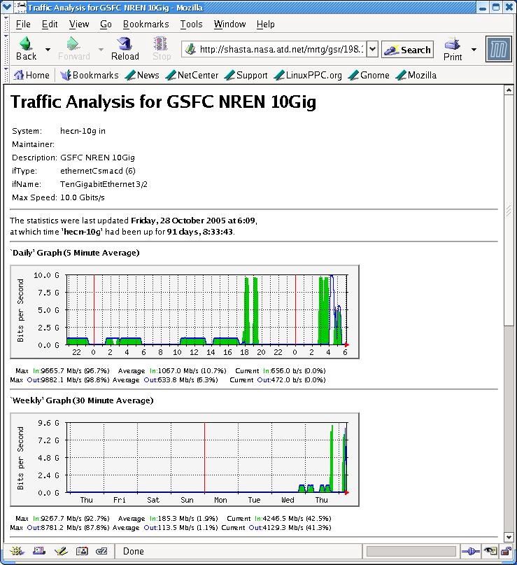 - On November 3, 2005, with assistance from GSFC's Bill Fink (606.1) and Paul Lang (ADNET), the ARC-based NASA Research and Engineering Network (NREN) project switched the routing of its production data flows between ARC's NAS supercomputer facilities and computers connected to GSFC's Scientific and Engineering Network (SEN). Such flows no longer use NREN's otherwise present production pathways implemented over Qwest's ATM-based Layer 2 service, which provided only ~100 Mbps throughput performance for data flows between the NAS and SEN-connected computers at GSFC, but instead now use the 26Oct05-initiated 1-Gbps end-to-end pathway that traverses the NLR's GE/VLAN-based Layer 2 service between NREN's Cisco 6506's in Sunnyvale and McLean and then traverses the DRAGON's ITU-channel26-compliant lambda between NREN's Cisco 6506's in McLean and GSFC, Data flows between ARC's NAS and computers connected to all other networks including GSFC's Center Network Environment remain unchanged. Hence the key result of this change is that computers connected to the SEN, particularly including those of the NCCS, can exchange data with those of the NAS, particularly including the Project Columbia supercomputer, at up to 1-Gbps or ~10 times the throughput rate that they could previously. Mrtg-generated timeline graphs showing the end of data flows with NAS on the SEN's former interface with NREN and the start of data flows with NAS on the SEN's new interface with NREN are provided.