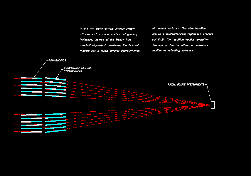 In a two stage design of an X-ray telescope , X-rays are reflected off two surfaces consecutively at grazing angles. Instead of the Wolter Type parabolic-hyperbolic surfaces, the Astro-E mirrors used a much simpler approximation of conical surfaces. This simplication made a straightforward replication process but limits the resulting resolution of the telescope. The use of thin foil, however, allows an much more extensive nesting of reflecting surfaces.